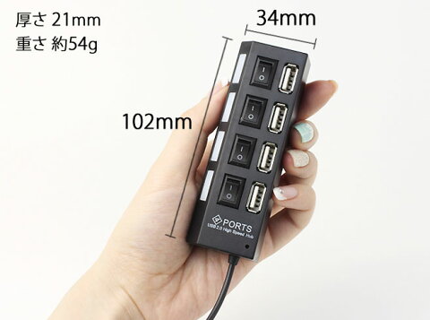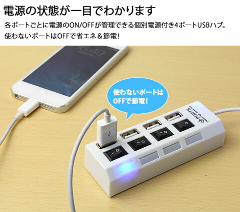節電USBハブ(個別電源スイッチ付き・4ポート)各ポートごとに電源のON/OFFを切り替えられるスイッチがそれぞれについています。